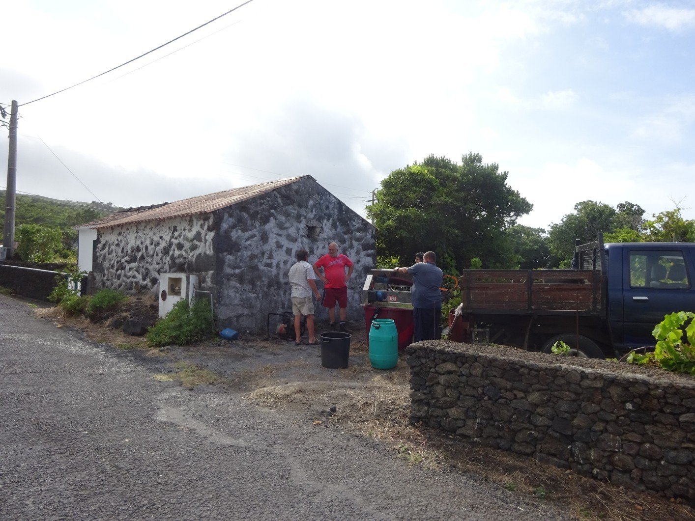 Poté, co jsme na západě ostrova Faial, nad městem Praia do Norte, navštívili oblast s názvem Zona Especial de Conservaçao da Caldeira e Capelinhos, zastavujeme nedaleko odtud u malého vinařského stavení, kde právě lisují hrozny. Lidé jsou velice příjemní a dávají nám hned ochutnat hrozny i čerstvý mošt. Chvíli na to se ještě chlubí fíkovou kořalkou, a tudíž my jim dáváme okoštovat pro změnu slivovici.