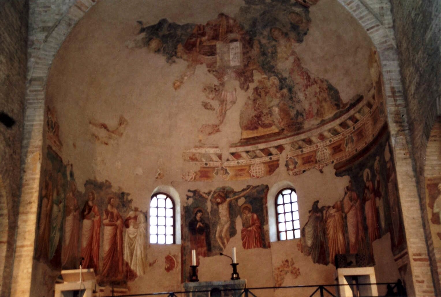 Velká freska v apsidě je tvořena dvěma reprezentativními motivy s oddělenými skupinami postav světců a dalšími posvátnými obrazy. Horní část představuje Krista Pantokratora, který pravou rukou žehná a v levé drží otevřenou knihu. Vedle něj vidíme dva ze čtyř evangelistů, a to Matouše a Marka s jejich atributy, andělem a lvem. Ve středu spodní části fresky se nachází Ukřižování, zobrazující Ukřižovaného, Pannu Marii a sv. Jana. Skvělé a inspirativní dílo zobrazuje také řady apoštolů, vedené sv. Petrem s klíčem a sv. Pavlem s mečem. Apoštolů je šest na každé straně a všichni mají v ruce Bibli. V chrámu najdeme také kněžskou galerii, jejíž rekonstrukce byla dokončena v roce 2000. Tento soubor děkanských medailonů byl rozšířen v I. polovině 18. století. Tvar obrazů se liší a nejstarší zobrazenou postavou je Peppo z Castiglione (1274). Tento sál byl také nově vybaven nejmodernější techniku a slouží pro pořádání konferencí.