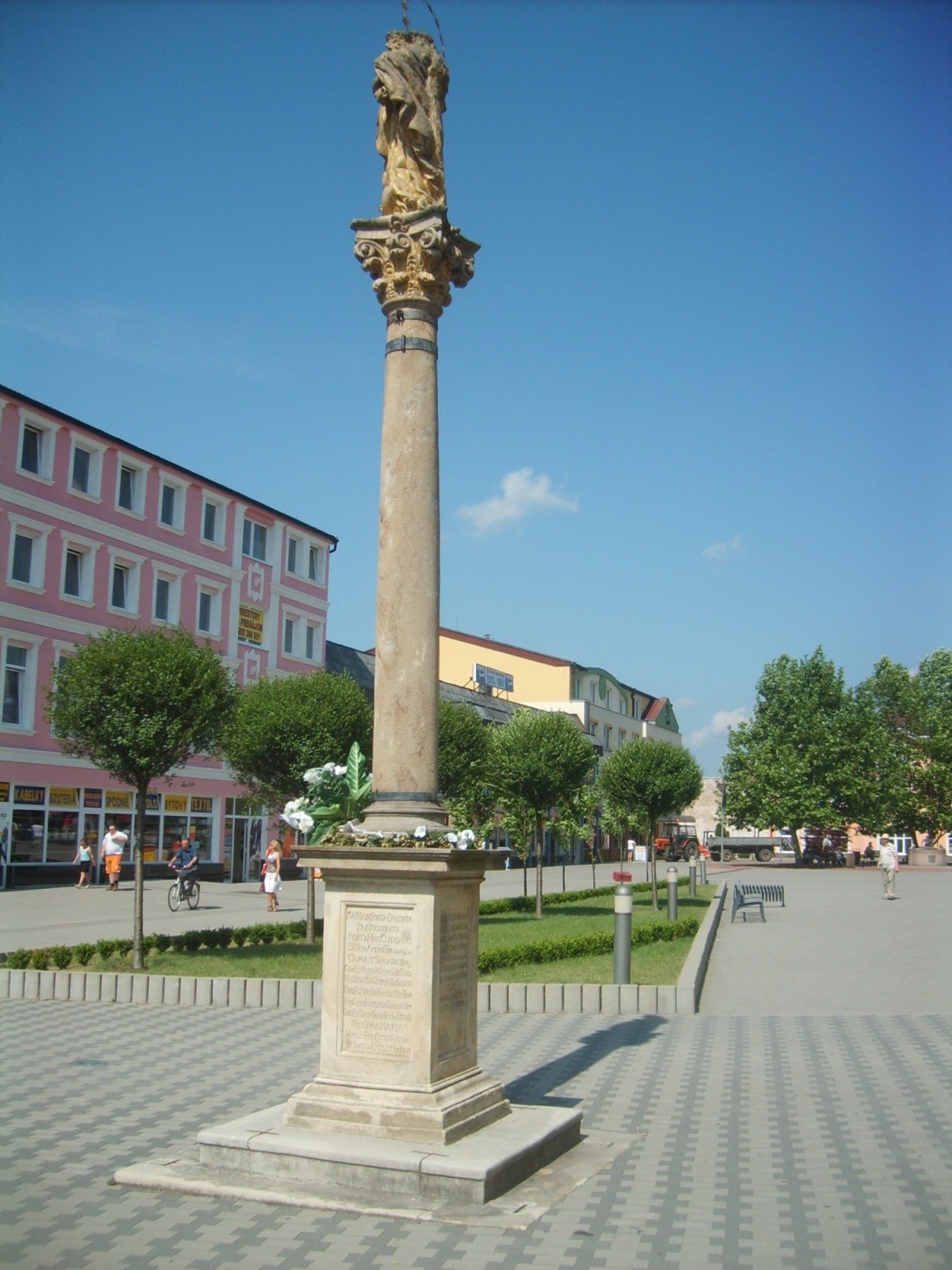 Barokový kamenný stĺp je postavený neďaleko kostola, na jeho vrchu je socha Najsvätejšej Panny, ktorá drží Božie dieťa vo svojom náručí. Tento Mariánsky stĺp dal v roku 1712 postaviť na južnej strane pred farským kostolom Najsvätejšej trojice rektor jezuitského skalického kolégia, páter Michal Dorza.
