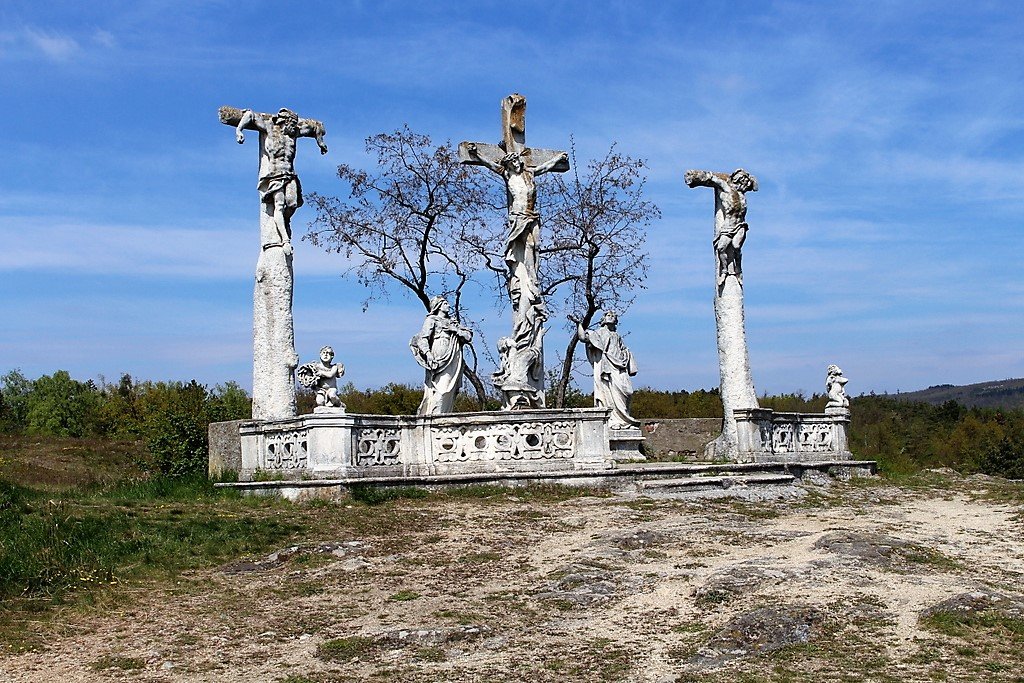 Z náměstí města se jde ke Kalvárii stejnou cestou, která vede ke známému větrnému mlýnu. Již nedaleko mlýna se nachází první sousoší křížové cesty. Jedná se o kamenné oltáře, na kterých jsou jednotlivé výjevy z křížové cesty. To první u větrného mlýna září novotou. Jednotlivá sousoší jsou rozmístěna kolem cesty, která mírně stoupá k vrcholu. Některá jsou po opravě, na jiných je vidět, co dokáže zub času. Cesta končí u velkého sousoší se třemi kříži. Ukřižovaný Kristus má po bocích kříže s lotry. Ve spodní části je socha Panny Marie a Máří Magdaleny. Třetí socha by mohla představovat oblíbeného Kristova apoštola, sv. Jana. Kolem sousoší je zdobná kamenná zídka. Na rozích v přední části sedí dva andělíčci. Jedná se o velmi hezké baroko, které bylo dokončeno v roce 1726. Z Kalvarie se otevírá hezký pohled na město a jeho okolí. Ale i blízké okolí nepostrádá na zajímavosti. Časné jaro tady musí být úžasné. Na okolních loučkách jsou již odkvetlé koniklece. V době mé návštěvy převládala žlutá, kvetly mochny a kručinky. V trávě se několikrát mihla zelená ještěrka, ale k pózování se neměla. Nezbylo než sednout na nedalekou lavičku a vychutnat si kouzlo tohoto místa.
