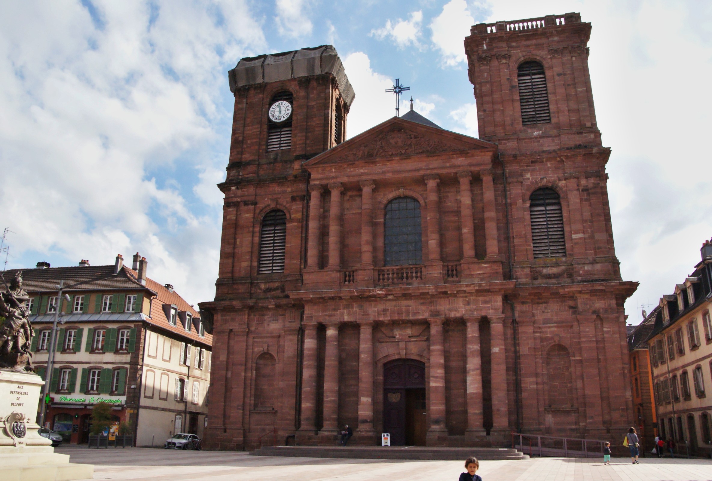 Se vznikem katedrály jsou spojována zejména dvě jména. Jedním byl významný a bohatý obchodník a mecenáš Henri Schuller (uváděn také jako Shuler), jehož syn se poté stal zdejším opatem, tím druhý uznávaný královský architekt Jacques Philippe Mareschal. Jako stavební materiál posloužil růžový pískovec ze 3 km vzdáleného lomu Offemont. Stavba byla zahájena 12. října 1727 a o čtyři dny později byl požehnán základní kámen. Věřícím pak byla poprvé otevřena v roce 1750, skutečně dokončena byla roku 1845, kdy - jak již bylo zmíněno - skončila výstavba jižní věže. Někdejší klášterní kostel se stal katedrálou v roce 1979.