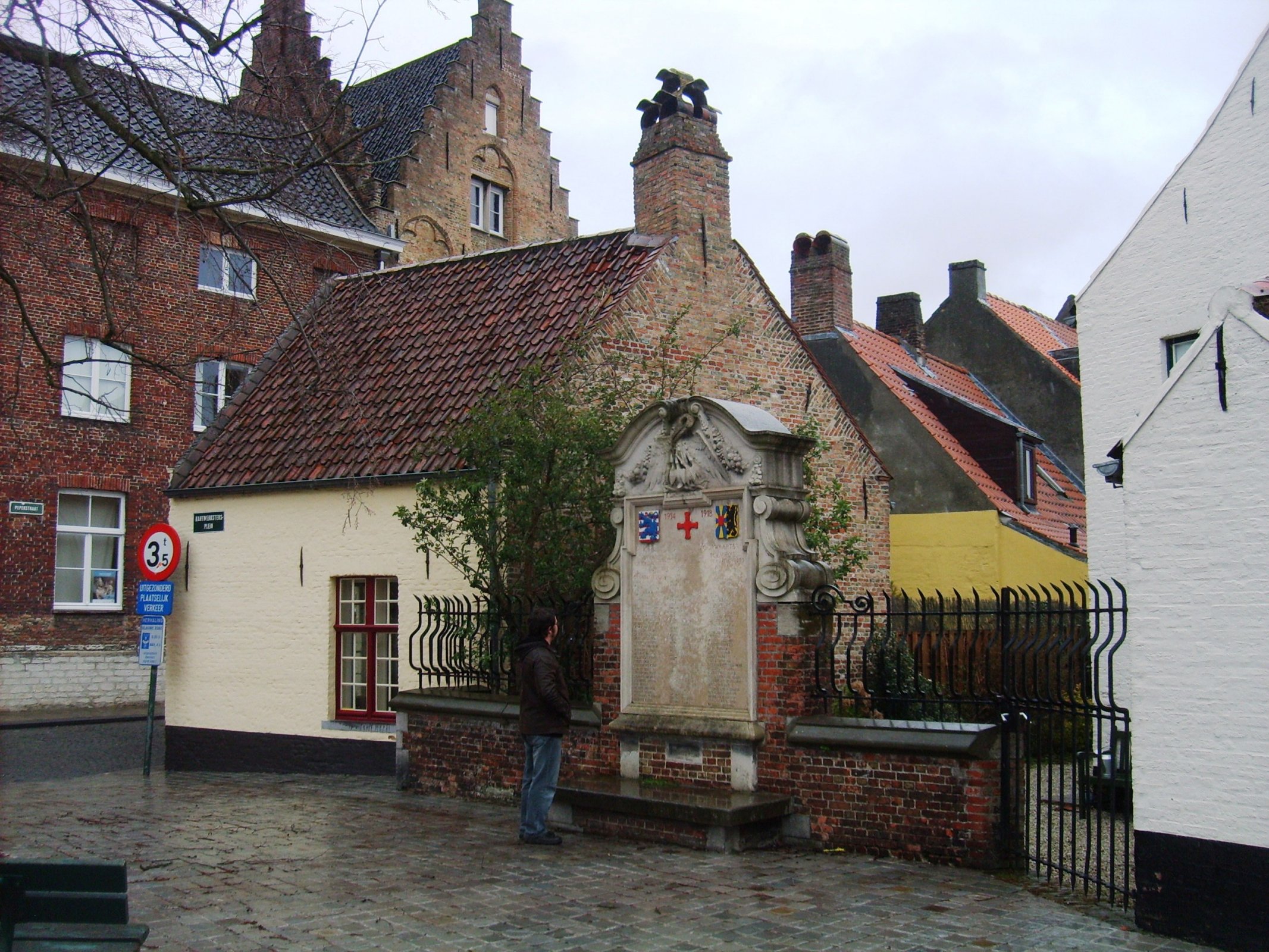 Námestie je vlastne iba taký malý nepravidelný trojuholník medzi ulicami Peperstraat a Rodestraat, dominuje mu pamätník padlých v období 1. svetovej vojny. Pamätník je postavený z kameňa a červenej pálenej tehly. V strede pamätníku je kamenná doska s menami obetí prvej svetovej vojny, v jeho hornej časti je v strede červený kríž a letopočet 1914 - 1918. V rohoch sú dva erby, erb vľavo je erbom mesta Bruggy, erb vpravo je z dvoch častí. Vpravo je čierny lev na žltom podklade, to je znak Belgicka, v ľavej polovici červené slnko s modrými lúčmi na žltom podklade, neviem čo znamená. Po polovicu dosky je pamätník ešte obmurovaný tehlou, ďalej už je zdobený kamennou výzdobou. V najvyššej časti je reliéf pelikána, ktorý krmí svojích päť mláďat.