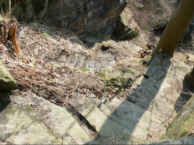 Odbočka Hřensko 4 km: Odbočka vede po schodech dolů od Belvederu, cesta je strmá a upravuje se.