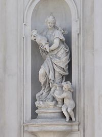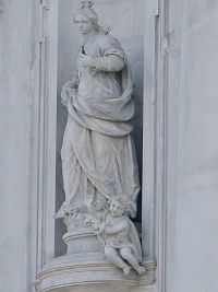 Vraťme se ale ke klasicistnímu průčelí, které je rozděleno na tři části polosloupy s kompozitními hlavicemi. Ve vrcholovém tympanonu je oválné oko a nad ním svatojakubská mušle. Ve velkých postranních nikách můžeme vidět alegorie čtyř hlavních ctností - Moudrost vytvořil Gaetano Susali, Spravedlnost Francesco Bonazza, Statečnost Giuseppe Bernardi a Rozvahu Alvis Tagliapietro. Nad tympanonem portálu je umístěna „zasvěcovací deska“ Santa Maria del Rosario, kterou zdobí pětice růží. Celkový vzhled chrámu pak dokreslují schodiště vedoucí ke vstupnímu portálu i dolů k vodě a – z větší dálky viditelné – dvě charakteristické nízké zvonice s cibulovými věžičkami a kupole s lucernou nad presbytářem.