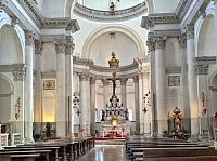 Před průčelím, které člení pilastry a polosloupy, se nachází schodiště. Interiér je jednolodní a víceméně klasicistní. Je rozdělen do tří částí, které mají rozdílnou funkci – presbytář je určen pro mnichy, apsida s hlavním oltářem pro votivní účely a chrámová loď pro farníky. V přední části lodi se nacházejí kaple, a to po třech na každé straně. Hlavní oltář je barokní a je zdoben mj. krucifixem a Campagniho sochami.