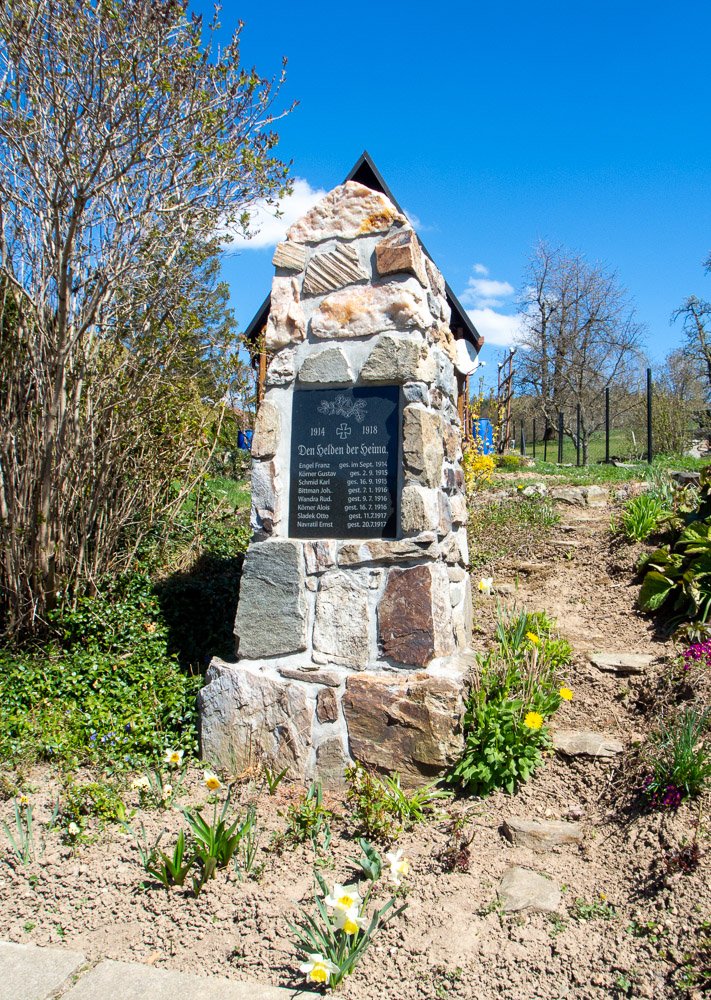 Jde o zděný kamenný obelisk z lomového kamene. Na čelní straně je umístěna leštěná kamenná deska s 8 jmény zdejších padlých a ztracených obyvatel.