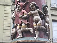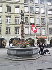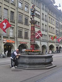 Dudácká fontána, svými barevnými figurkami vlastně zobrazuje scénu, kde kráčí koncertující dudák, doprovázený zlatou husou a malou opičkou hrající na flažolet (dřevěná flétna). Celá skupina má být oslavou veselí, života, hudby, tance a kulinářských lahůdek. Právě tato témata byla typická pro danou dobu a společenské aktivity u středověkých bernských fontán. Autor článku si zde proto dal alespoň jedno plechovkové …