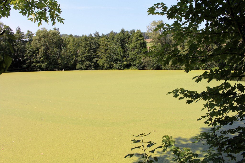 Nový rybník, volná hladina v pozadí porost okřehku menšího