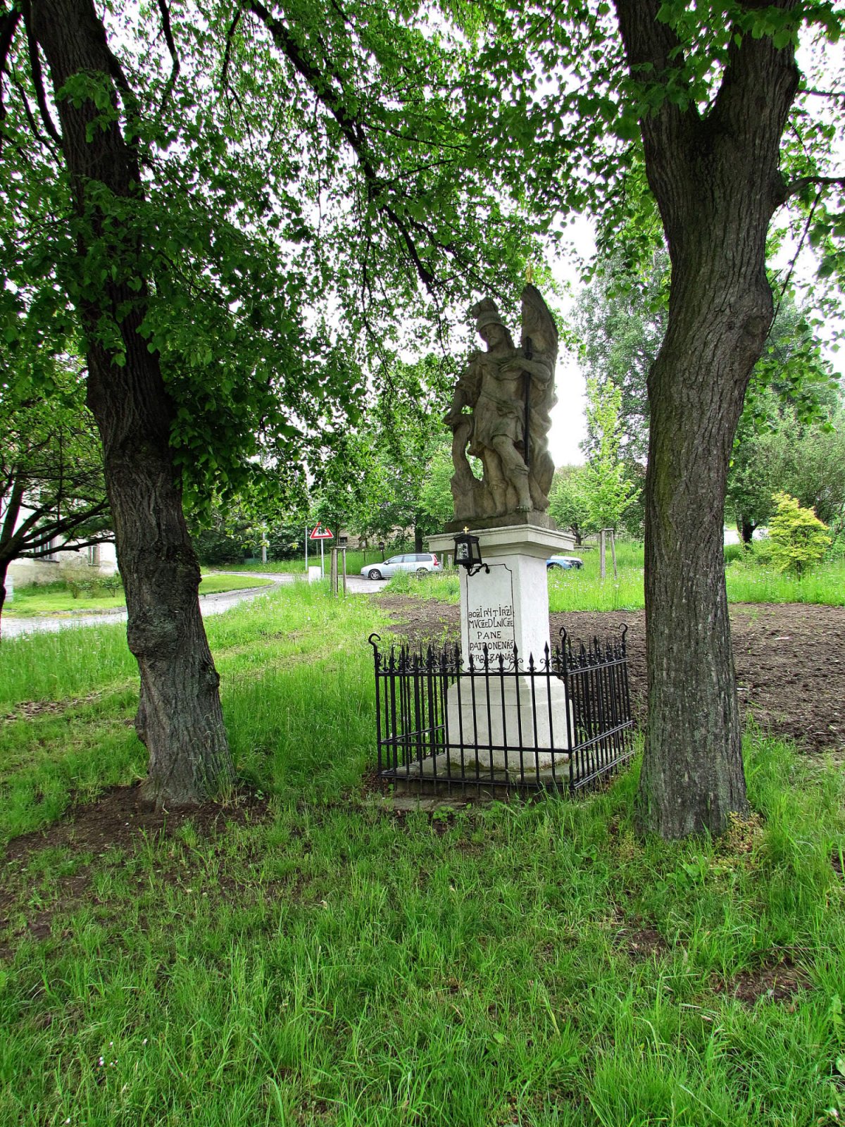 Skulptura je umístěna na vysokém hranolovém soklu s tesaným nápisem a celek obklopuje plůtek ve tvaru čtverce s kovanou mříží. Jedná se o ukázku pozdního lidového vesnického baroka. Socha sama není dokonalá, světec má totiž poněkud nepřirozeně vykroucenou nohu.
