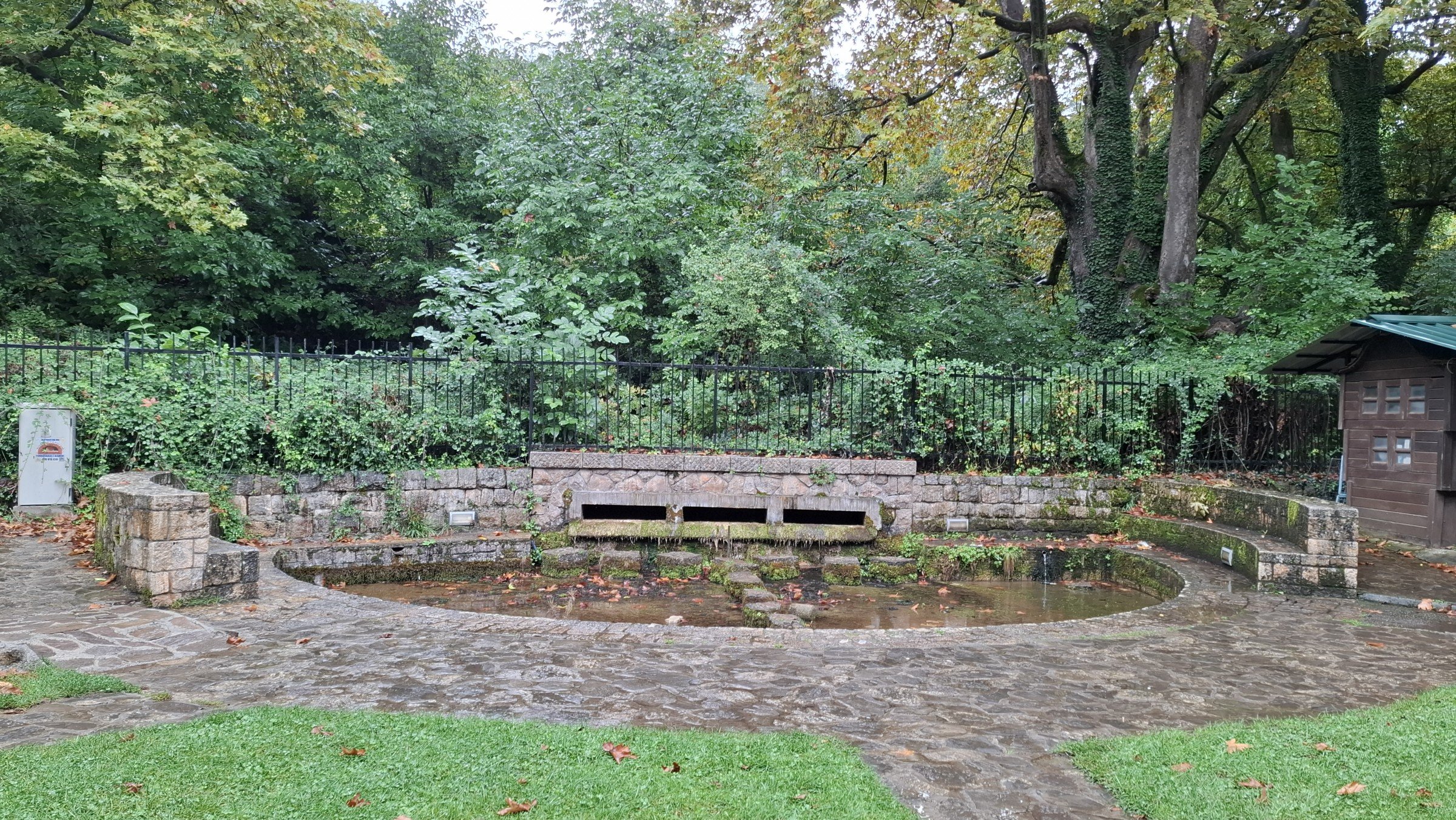 Malý park s lávkami a kamennými studnami, ideální pro krátkou zastávku nebo piknik.