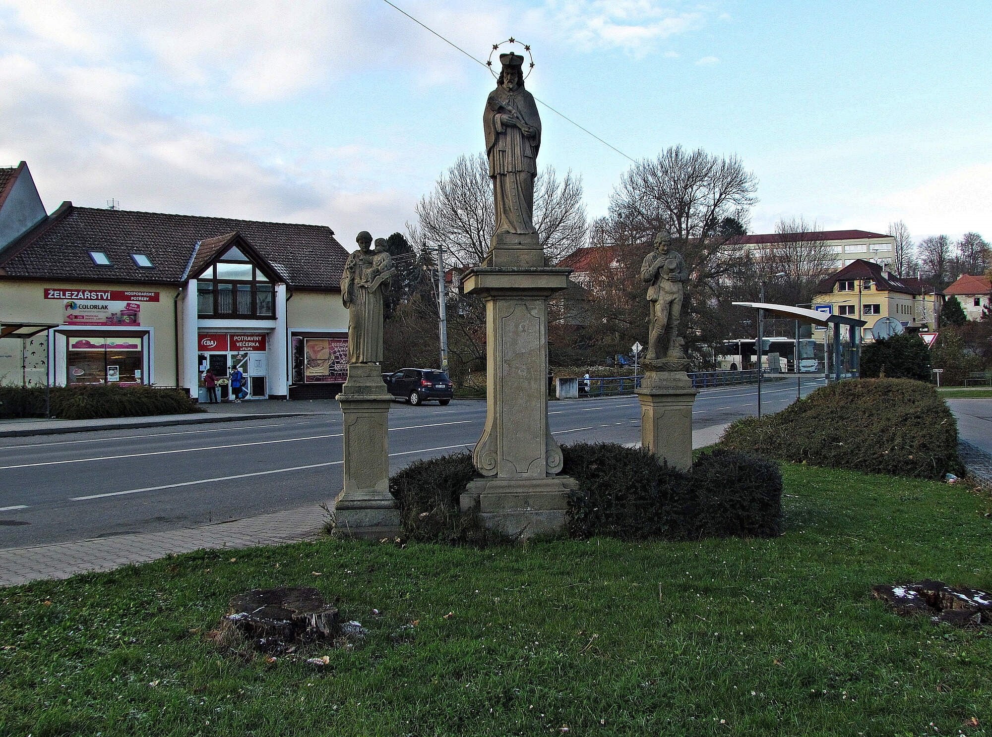Tvoří soubor oddělených pískovcových skulptur (datovaných LP 1909), umístěných za křížovatkou ve středu obce u silnice vedoucí do Topolné. Každá je umístěna na samostatném štíhlém hranolovém soklu, přičemž je prostřední podstavec nejvyšší a také socha sv.Jana Nepomuckého na něm umístěná nejrozměrnější. Skulptury obou světců po jeho bocích jsou mnohem menší, zato ale stejně vysoké. Podstavec pod svatým Janem je trojdílný a výškově odstupňovaný. Jeho střední část je obzvláštěna jemnými volutovými křídly, na čele se zrcadlovým rámem. Světec byl vysochán v klasické podobě s biretem na hlavě, hvězdnou svatozáří a trojdílným kanovnickým rouchem. I když je ze všech tří sochou největší, nedosahuje životní velikosti.