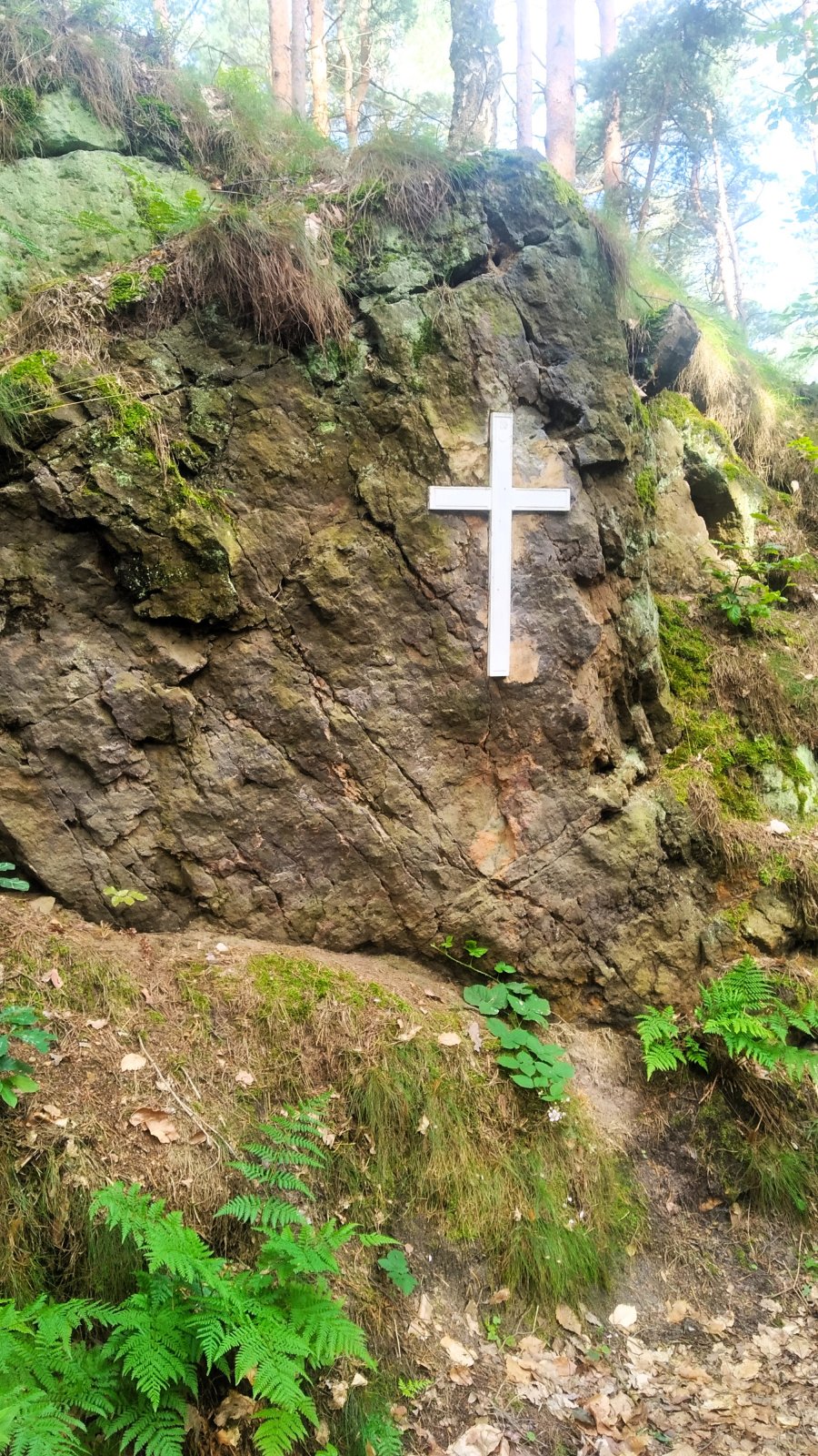 Velký bílý kříž je upevněn na skále u turistického rozcestí modře a zeleně značených cest nad Horním Oldřichovem, městskou částí Děčína.
