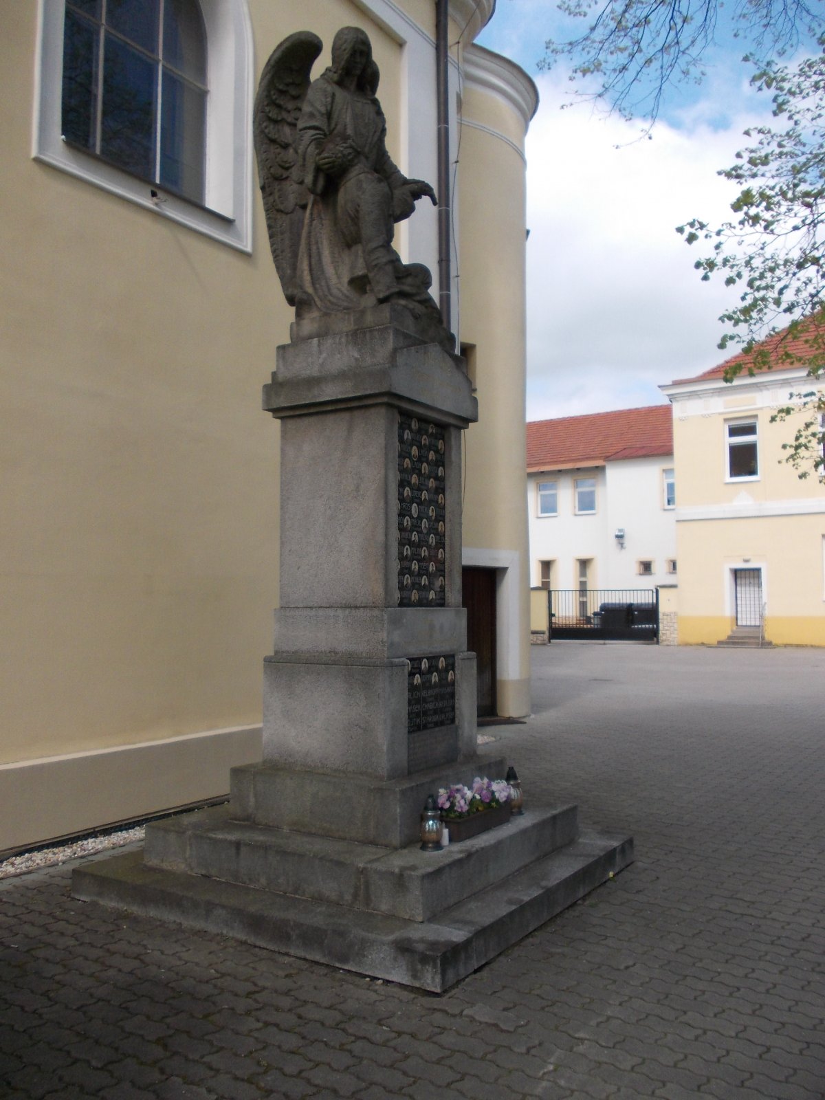 Pomník tvorí súsošie umiestnené na kamennom hranolovitom stĺpe a podstavci s tromi schodmi. Súsošie znázorňuje umierajúceho vojaka počas boja na fronte a anjela, ktorý ho pridržiava a tíši jeho bolesť. Pod súsoším je v kameni vytesaný letopočet a nápis : 1914 - 1918 Na paměť prolité krve a hořkých slzí.