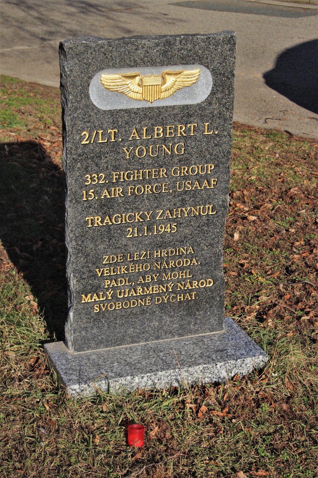 Dne 21. ledna 1945 provedlo 170 bombardérů B-17 za doprovodu 130 stíhaček nálet na vídeňské rafinerie pohonných hmot. Ještě nad Vídní došlo k blíže neurčenému poškození Mustangu P-51C od 100. perutě 332. stíhací skupiny. Jeho pilot 2/Lt Albert Louis Young však s ním ještě doletěl do prostoru nad obec Blučinu, kde se pokusil o seskok padákem. Jelikož však byl bohužel příliš nízko nad zemí, padák se mu již nestihl otevřít a pilot po pádu zahynul. Letoun se zřítil na pole severně od Blučiny a explodoval. Trosky byly výbuchem rozmetány několik desítek metrů daleko. Mrtvé tělo amerického černošského letce bylo nalezeno asi jeden kilometr severovýchodně od obce.
