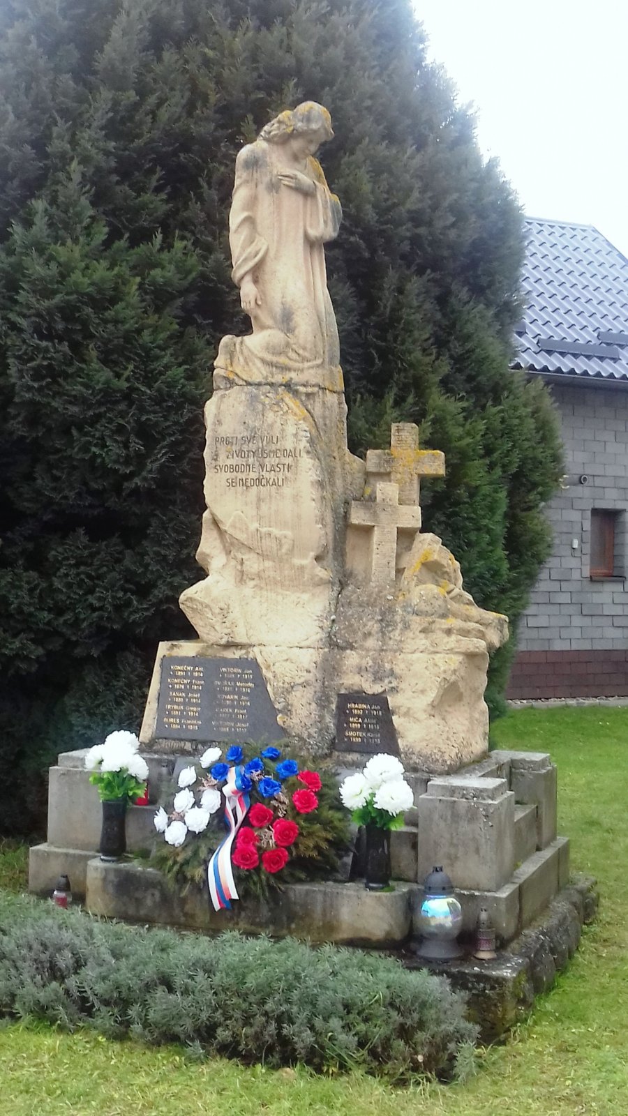 KONEČNÝ Ant., KONEČNÝ Frant., SAŇÁK Josef, TRYBUS Gregor, BUREŠ František VIKTORÍN Jan, KOVAŘÍK Jan, MAREK Frant., VIKTORÍN Josef, HRABINA Jan, MIČA Alois, ŠMOTEK Karel. Pod doskou vľavo je nápis BUDIŠ VÁM ZEMĚ LEHKOU. Dole na podstavci je ešte jedna pamätná doska, tu zakrýval veniec vďaky. Na doske je nápis JÁN JURÁŇ 26. 10. 1900 BYL VĚZNĚN V NĚMECKÝCH ŽALÁŘÍCH A PO ÚTRAPÁCH ZEMŘEL.