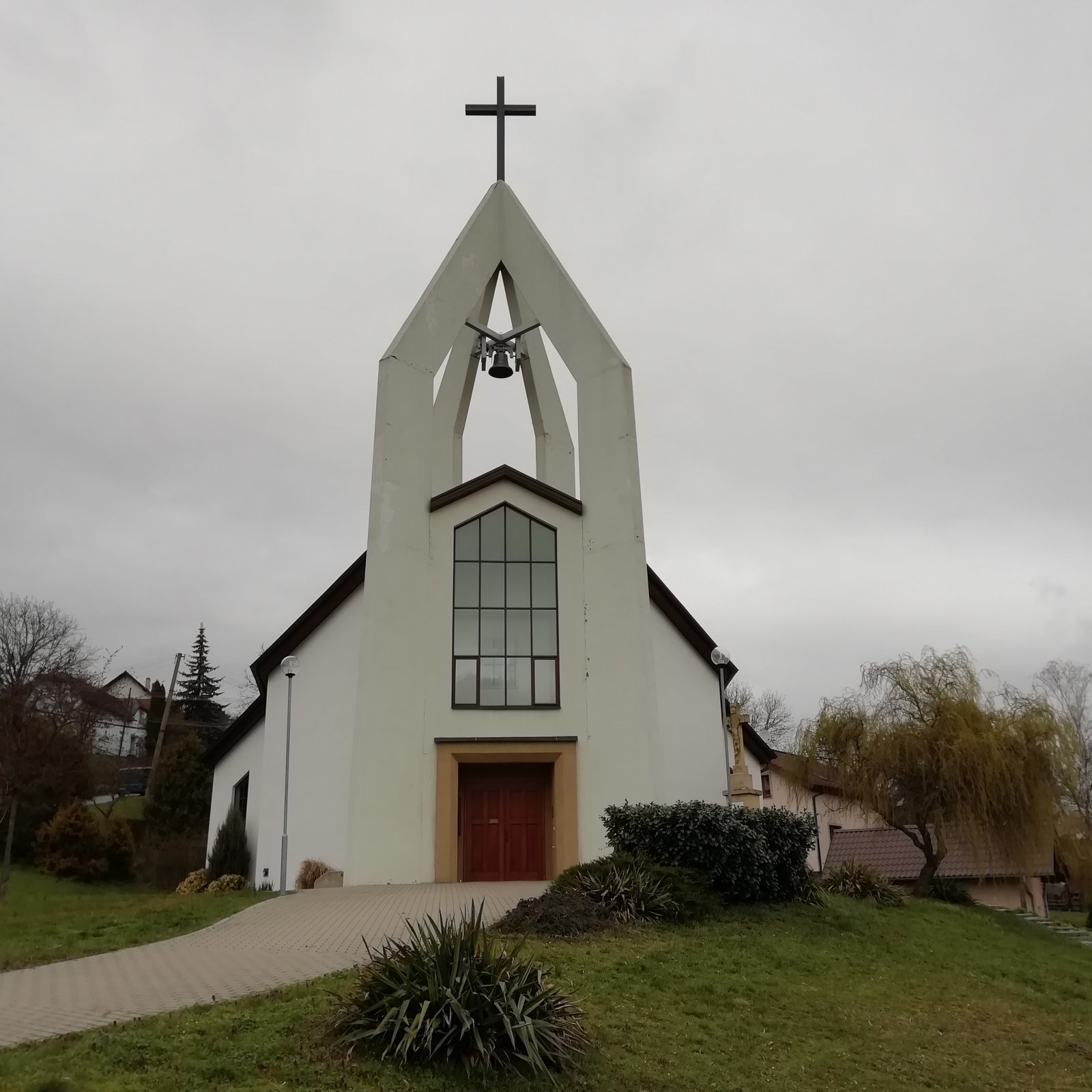 Vpravo pred kostolom je umiestnený kamenný kríž s bielou mramorovou tabuľou a nápisom POCHVÁLEN BUĎ PÁN JEŽÍŠ KRISTUS.