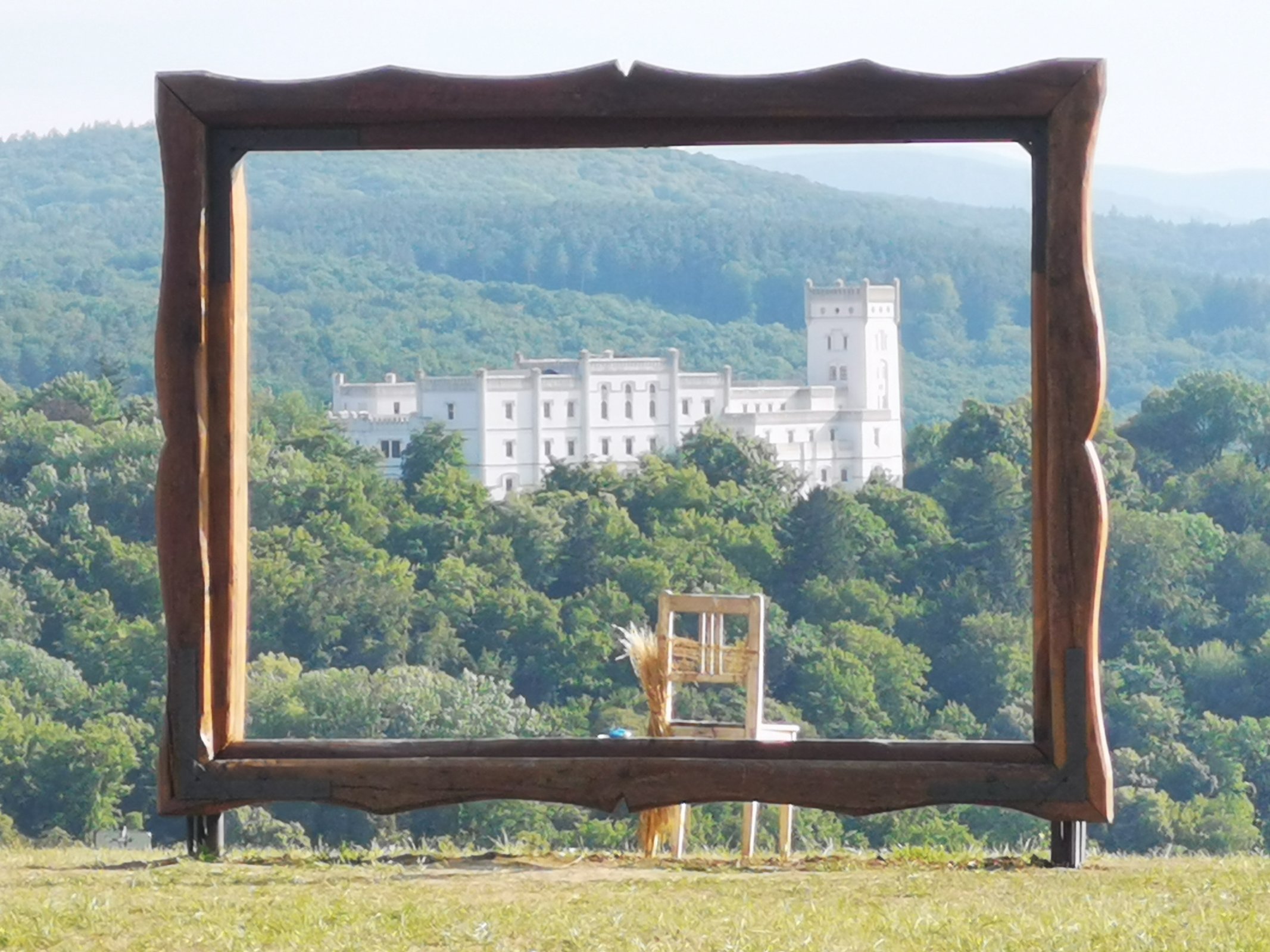 Ďalšou zaujímavosťou a miestom na zhotovovanie si pekných fotografii je obrazový rám - ,,vyhliadkové okno,, o rozmeroch asi 2 x 1. 5 metra. Už som videla na fotkách pár takýchto rámov, kde sa dalo zvečniť na pamiatku s okolitou krajinou. Tieto fotografie sa mi vždy páčili. Teraz sme aj my na takýto obrovský rám konečne natrafili. Z tohto rámu sa dajú nafotiť pekné fotky na pamiatku aj so zámkom Nový Svietlov. K fotenia alebo len tak na posedenie v ,,pohode,, je k dispozícii staršia drevená stolička - ,, letní posezení,,.