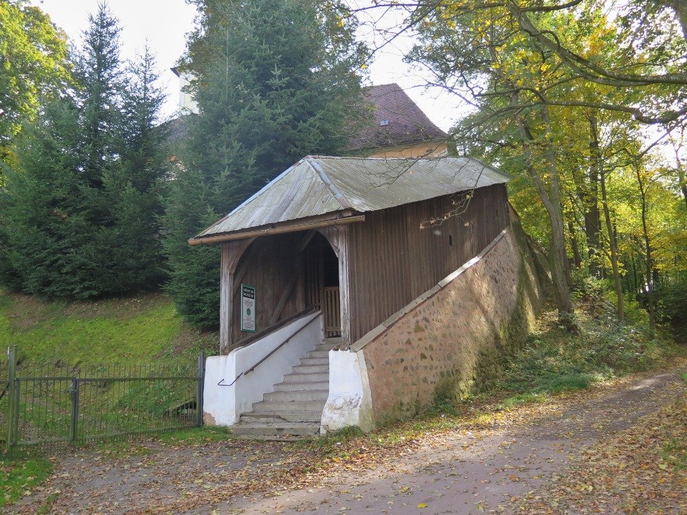 Schodiště je vlastně přístupovou cestou ze vsi na hřbitov a v podstatě se jedná o bedněním krytou chodbu s jednoramenným schodištěm o 43 kamenných stupních. Na kamenné podezdívce spočívá dřevěná konstrukce zevně opláštěná prkny, s volným podhledem do hambalkového krovu. Střecha je sedlová, nad vstupem od silnice, který je obloukově zarámován, je střecha zvalbena. V horní části schodiště je v zaslepeném čele z venkovní strany umístěna nika ve tvaru konchy s širokým půlkruhovým záklenkem, do které bylo osazeno sousoší Olivetské hory. Na vnitřní straně schodiště, připomínajícího moravskotřebovské Schody mrtvých, pak najdeme velký kříž s korpusem Krista. Východ na hřbitov je proto vyveden do boční stěny schodiště.