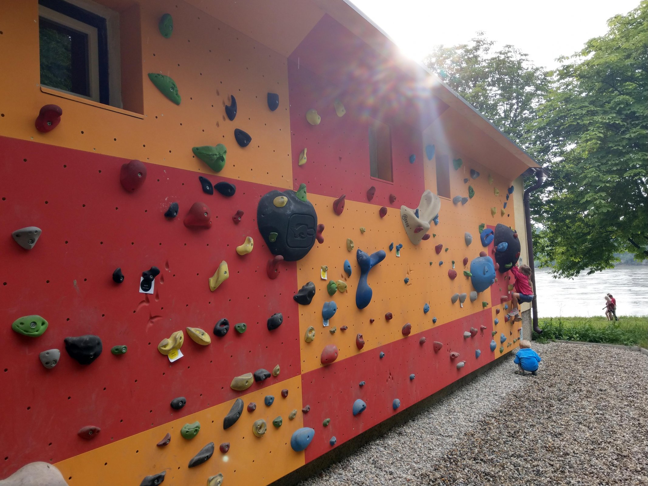 Na dunajskej promenáde, kúsok od detského ihriska, neďaleko začiatku turistických trás, nájdete skryté boulder lezecké ihrisko vybudované z jednej steny domčeka. Je bezplatné a neoplotené.