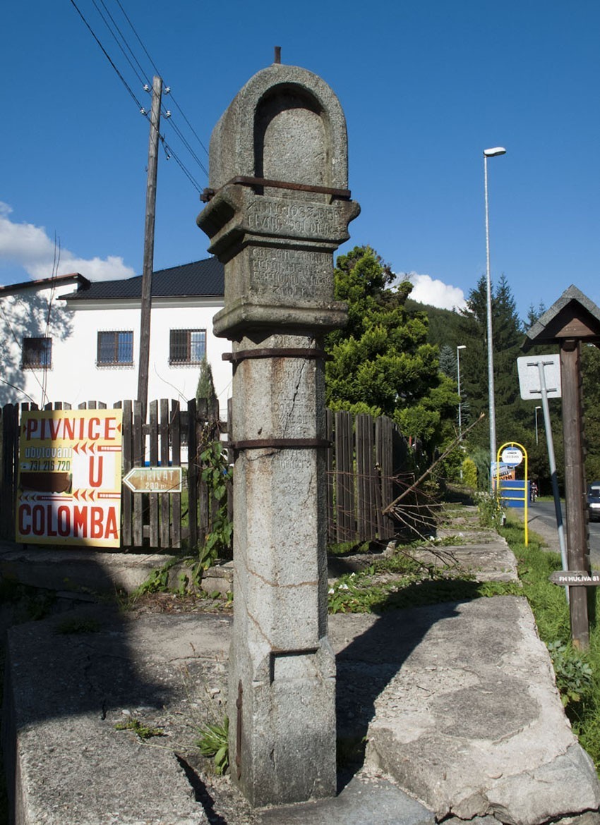 Boží muka v Koutech v pozadí bývalá pošta později Heliasport
