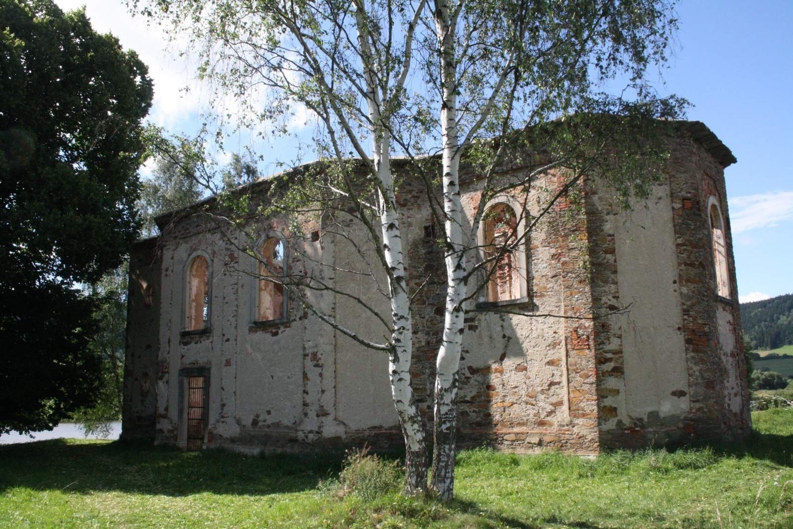 Dnes zde tedy můžeme spatřit pozůstatky jednolodního barokního kostela s obdélnou lodí s výraznými zkosenými nárožími, odsazeným trojboce uzavřeným presbytářem a obdélnou předsíní před západním průčelím. Z bývalé šindelové valbové střechy se bohužel nic nedochovalo. Hlavní západní průčelí kostela je prolomeno obdélným kamenným portálem vchodu a velkým, obdélným polokruhově zakončeným oknem v ose nad ním. Po stranách vchodu jsou mohutné pilastry. Podélné stěny lodi kostela jsou prolomeny po jednom obdélném vchodu v západní části a dvojicí velkých obdélných polokruhově zakončených oken. Stejná okna jsou v bočních a závěrové stěně presbytáře. Boční stěny předsíně kostela jsou otevřeny dvojicemi oválných okének nad sebou, osvětlujícími dříve schodiště na kruchtu. Vnější stěny kostela jsou členěny širokými lizénovými rámci.
