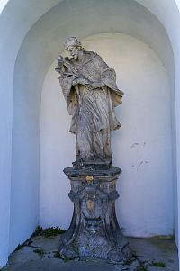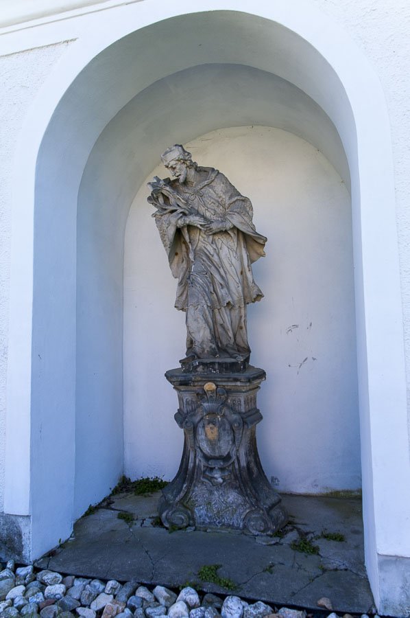 Právě u kostela v nice vnější zdi u závěru svatostánku. Jde o slušné dílo, které znázorňuje světce zhruba v životní velikosti. Ikonograficky je umučený pražský vikář zpodobněn zhruba v tradičním kánonu. Sv. Jan je znázorněn ve vzpřímeném postoji v mírném naklonění na pravou stranu. Šat je vyveden v drobných záhybech a precizních detailech (lem roucha, vázání přehozu z ovčí kůže, límec). Světec drží v náručí kříž s Kristem, kněžský biret má nasazený.