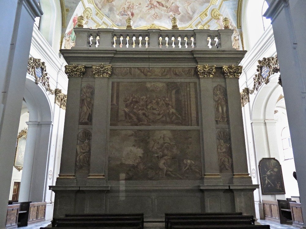 Samostatnou kapitolou je malířská výzdoba centrální kopule, kde je hlavním tématem oslava Panny Marie jako královny nebes. Monumentální malba sice byla opakovaně restaurována, ale stále je považována za cennou barokní práci malíře Františka Řehoře Ignáce Ecksteina. Ve středu kompozice se nachází Bůh Otec drží v ruce zeměkouli. Druhou rukou ukazuje na trůn pro Krista a hledí přitom na Pannu Marii s Ježíškem. Nad Bohem Otcem se vznáší holubice Ducha svatého a celou skupinu obklopují andělé oslavující Matku Boží. Nechybí zde ani archandělé (Gabriel s lilií, Michael se štítem i miskami vah a Rafael s poutnickou holí). Vše obklopuje iluzivní zlatý rám a postranní evangelisté a církevní učenci. Na dalších, menších freskách můžeme vidět např. Pannu Marii na oblacích, truchlící Pannu Marii s mrtvým Kristem, plačící Máří Magdalenu nebo koncertující anděly a krále Davida hrajícího na harfu.