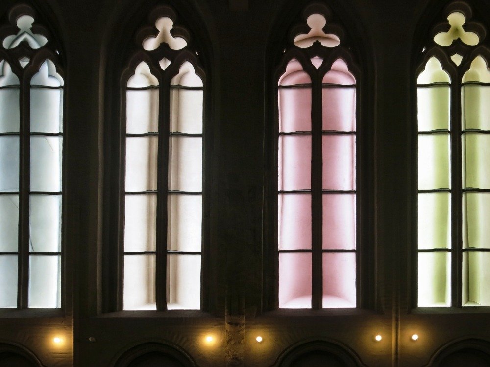Na závěr snad ještě pár čísel a doplňujících informací. Rozměry vitrážových oken jsou 2,8 x 1,5 metru (2 okna), 6,3 x 1,5 m (4 ks) a 5,8 x 2,4 m (2 ks). Celkem se jedná o 90 bloků litého skla o tlouště od 2 do 7 cm a hmotnosti 20 až 60 kg.