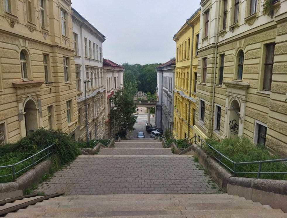 Někdejší zemědělská oblast Černá pole se v II. polovině 19. století začala pomalu měnit ve vilovou čtvrť, kterou brzy doplnily monumentální činžovní domy. A také pozoruhodná ulice, která se dříve jmenovala Na schodech a od roku 1946 nese jméno Schodová. Plným právem, protože tuto ulici – resp. její dolní část - tvoří 99 schodů. To ovšem zdaleka není jediná její zvláštnost či zajímavost.