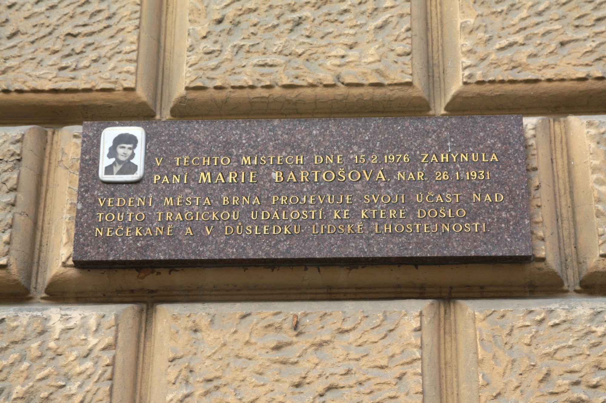 Pamětní deska se nachází na domě v ulici Pekařské číslo 62 na Starém Brně. Připomíná tragickou událost, která se zde stala 12. února 1976, kdy zde došlo k propadení nástupního tramvajového ostrůvku a následného zřícení několika zde stojících osob do hluboké jámy. Většině se však podařilo vylézt. Marie Bartošová sama do propadliny nespadla, ale pomáhala staršímu muži. Ten se držel podzemních elektrických kabelů. Náhle však proud vody utrhl část svahu a Marie Bartošová zmizela v podzemí s proudem vody a bahna. Tělo oběti se dlouho nedařilo najít, policie případ uzavřela po deseti letech a žena byla pak prohlášena oficiálně za mrtvou.