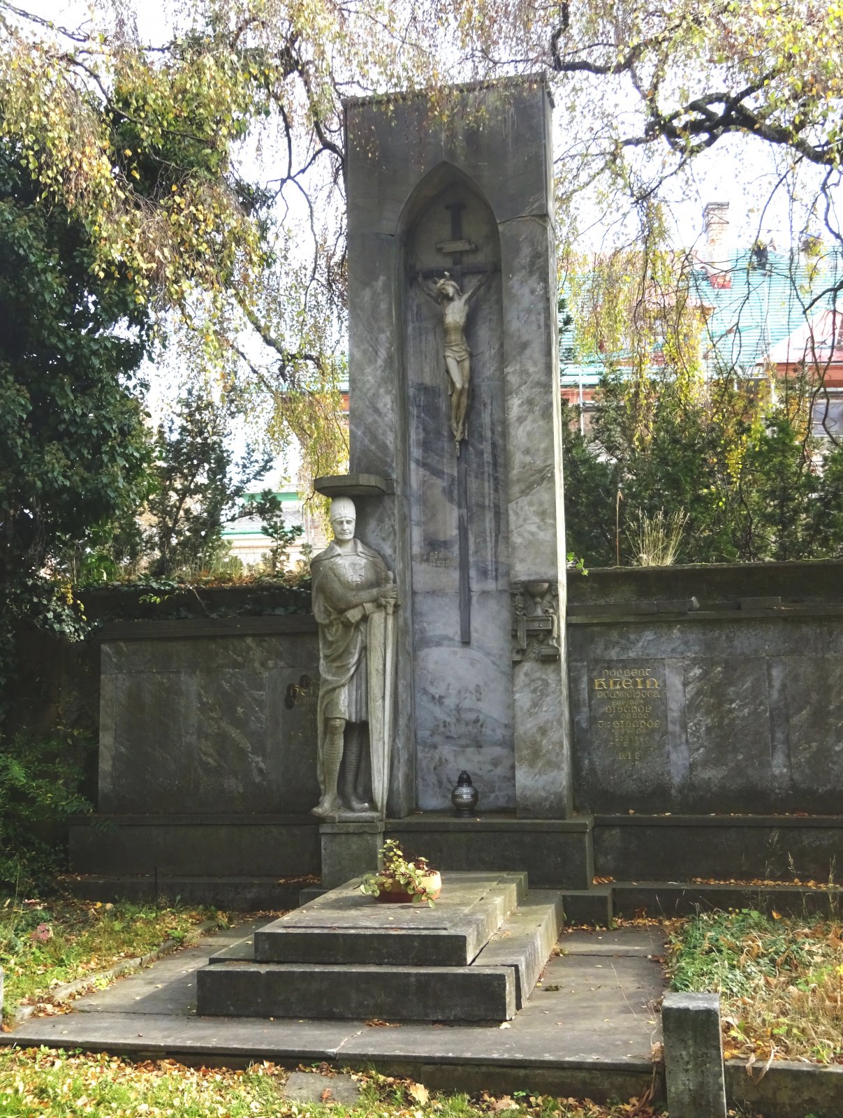 Ráda navštěvuji hřbitovy a zvláště ty staré, kde se člověk setká s nádhernými uměleckými díly. Dalším takovým dílem na Starém hřbitově v Bruntále je hrobka velmistrů Řádu německých rytířů. R. 1621 Karel Habsburk, velmistr Řádu německých rytířů, dostal panství od svého bratra císaře. Mramorová, archiketkonicky vzácná hrobka s korintskými sloupy je dílem sochaře Josefa Obetha (1874 - 1961). Dominuje jí kamenná socha - postava rytíře ve zbroji (výška 170 cm), opírající se o štít a meč. Nad sochou uprostřed je kříž s postavou Ježíše Krista. Na kamených deskách vedle sochy jsou nápisy - po levé ruce sochy (z našeho pohledu napravo) - Norbert Klein (1923 - 1933) a po pravé ruce - Paul Heider (1933 - 1936), kdy byli ve funkci velmistrů.