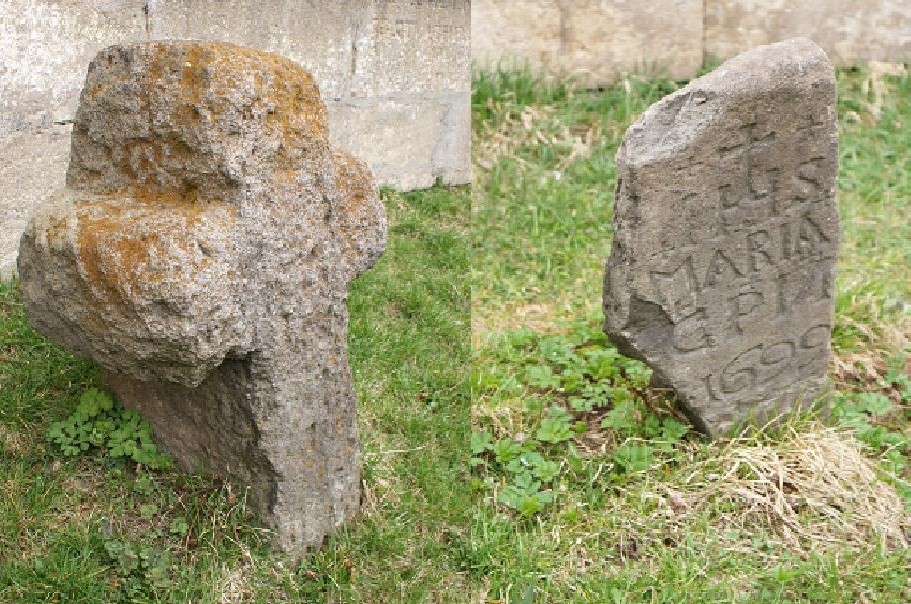 Oba uvedené kamenné artefakty najdete – nedaleko od sebe - při jižní straně kostela. Pískovcový kříž je asi metr vysoký (informační prameny udávají hodnoty od 90 do 100 centimetrů, 75 cm široký a jeho tloušťka je přibližně 30 centimetrů. Na pravé polovině jeho hlavy a břevna lze nalézt pět – dnes již téměř neznatelných důlků - které jsou podle pověsti kouzelné.