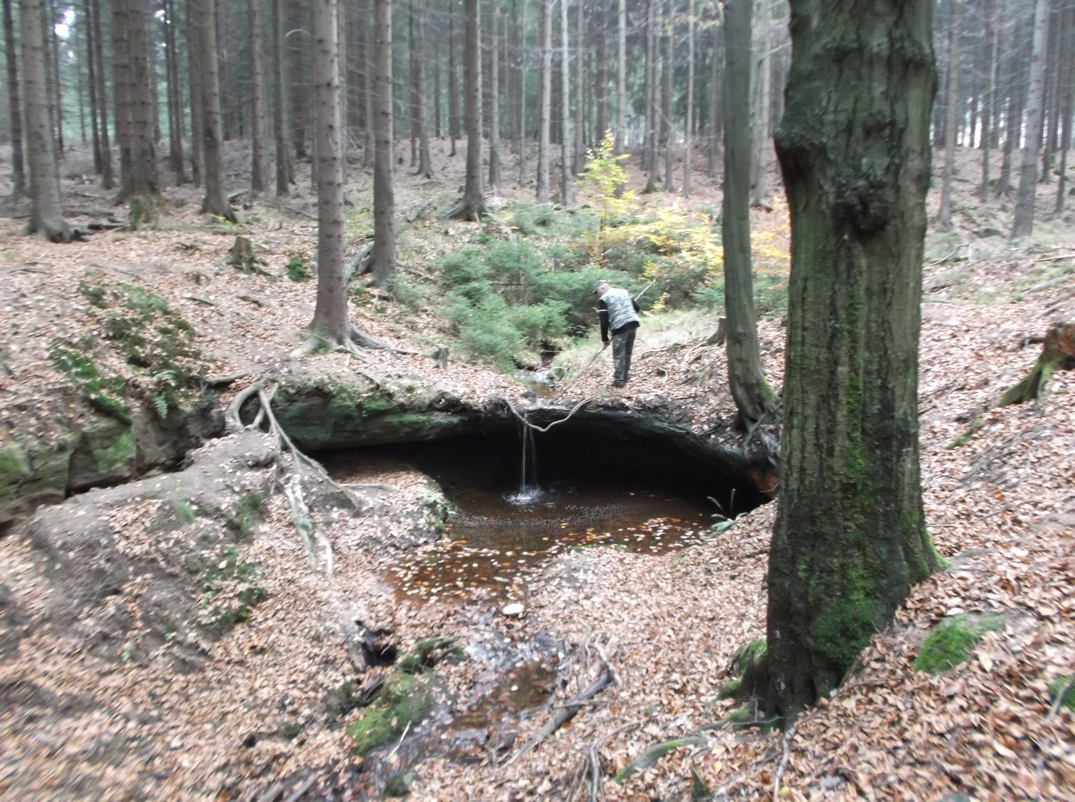 Z kopce(Šébr) od pravotočivé zatáčky 2 cesta v levo je malý plac na parkování.Odtud pěšky, po cestě asi 800 metrů,dorazíte na rozcestí.Dáte se přímou cestou,od křžovatky asi tak 100 metrů,bude v levo malé údolíčko s potokem.Dejte se proti toku a dorazíte k jeskyni s vodopádem.