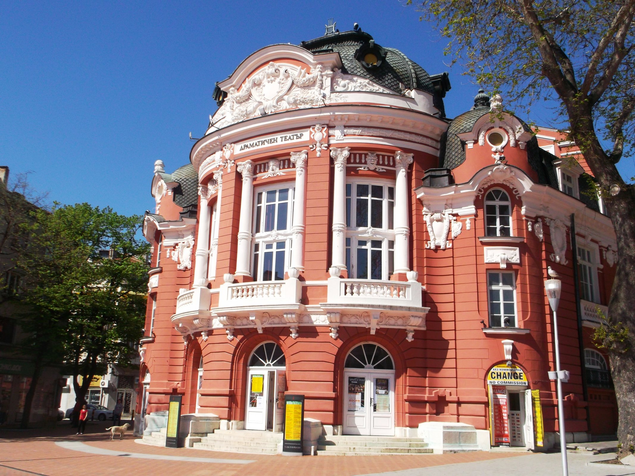 Architekti použili pri stavbe novej budovy divadla secesné umenie s prvkami novobarokového slohu. Budova má v pôdoryse tvar akoby klina, ktorí je v prednej časti zaoblený a v zadnej zúžený do obdĺžnika. Priečeli budovy je zaoblené, má bohatú výzdobu. Nad troma vchodmi do budovy sú tri okná so zdobenými stĺpami a balkony s balustrádami. V strede nad oknami je nápis Dramatičen Teatr, nad nim je krásný biely reliéf.