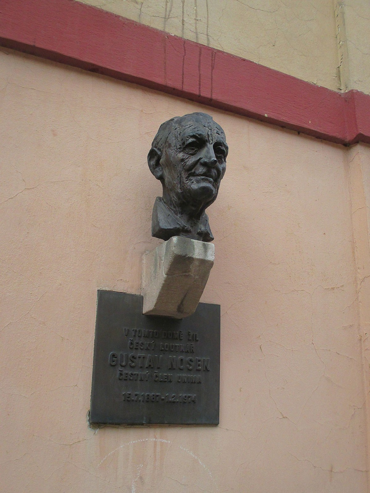 Bronzová busta je osazená na pískovcové konzole a pod ní je bronzová deska s nápisem: "V tomto domě žil český loutkař Gustav Nosek čestný člen unima 15. 7. 1887 - 1. 2. 1974".