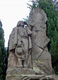 Na horní části stojí prostovlasý (snad) vojín, v ruce drží klobouk s pentlemi, levá ruka je v salutující poloze. Vedle je pokračující obelisk, na vrcholu vycházející slunce. Pod ním nápis 28.10.1918, níže pokračuje: „NIKDY NEZAPOMENEME NAŠICH TRPÍCÍCH“.