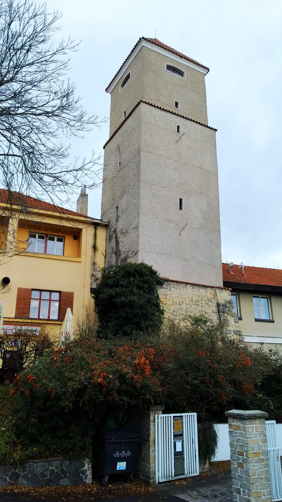 Ve Vodárenské ulici v Mělníku stojí 20 metrů vysoká hranolová věž z 15. století.