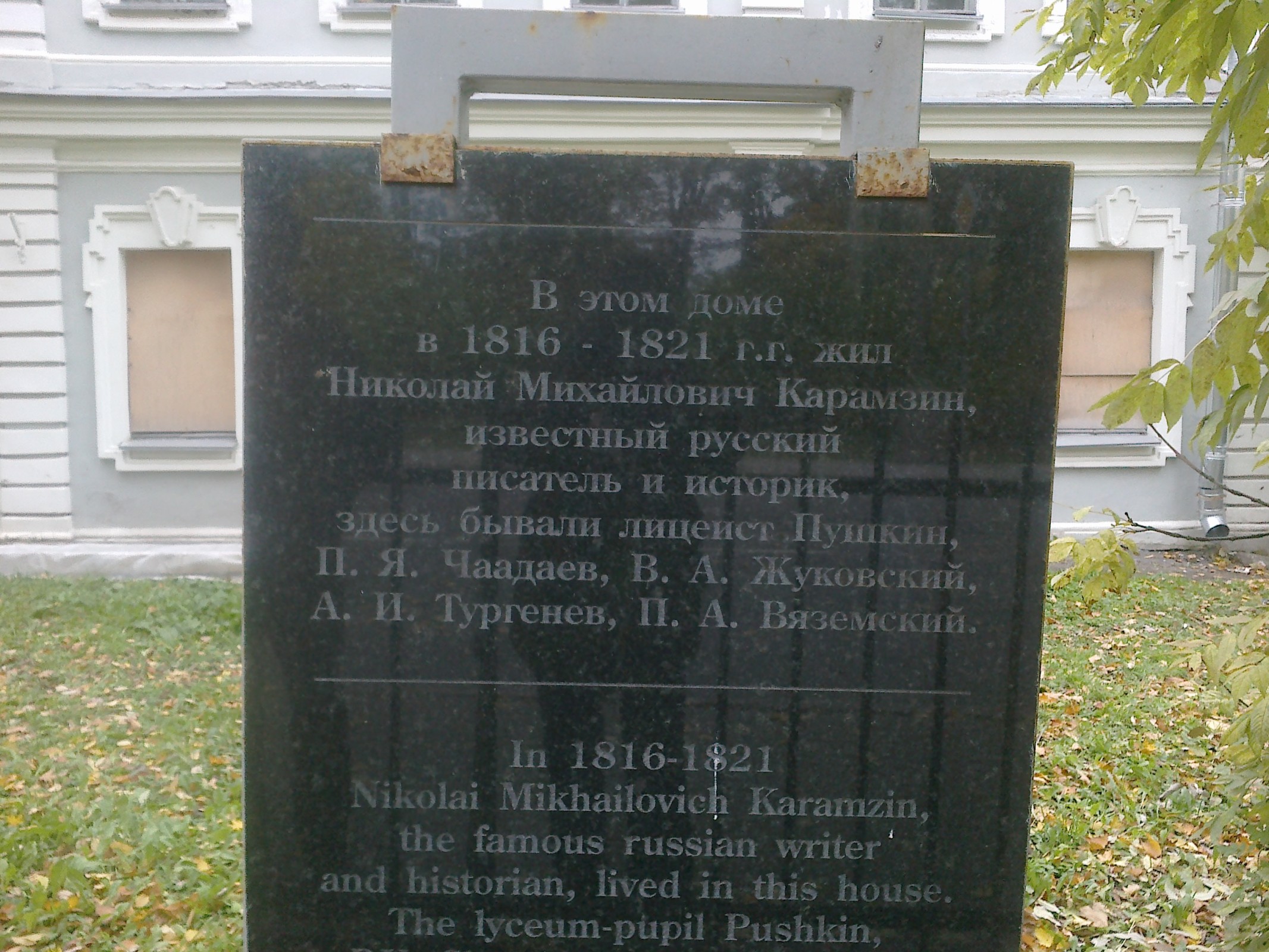 V Sadové ulici v Carském Sele se nachází dům, v němž nikdo nebydlí a je vidět, že není ani opravený. Na desce před domem je nápis v ruštině a angličtině: "V tomto domě v letech 1816-1821 žil Nikolaj Michajlovič Karamzin, známý ruský spisovatel a historik. Žili zde lyceista Puškin, P. J. Čadajev, V. A. Žukovskij, A. I. Turgeněv, P. A. Vjazemskij. (Spisovatelé 1.poloviny 19. století)