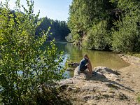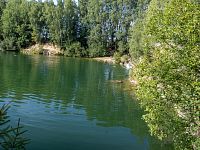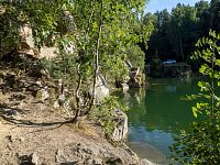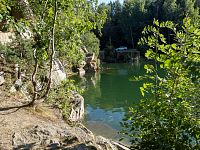 Většina horních okrajů lomu dosahovala do zhruba stejné úrovně, takže břehy jsou tu celkem zarostlé. Výše nad hladinu dosahuje skála poblíž příjezdu.