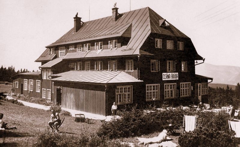 Historická kreslená pohlednice Černé boudy s popisem  autor: dupis