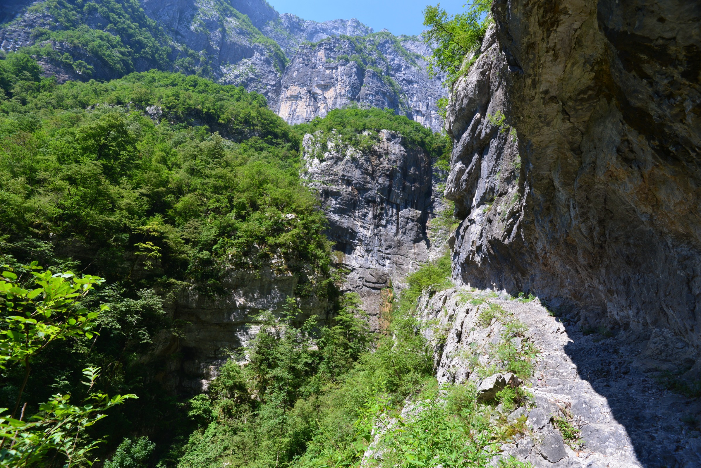 Za lesem se už jde kaňonem kolem vody. Scenérie je nádherná. Bílé vápencové balvany a kolem se prodírá řeka. Jaké to tu musí být na jaře, když v horách taje! Příkré skalní stěny. Stezka je místy zasekaná ve skále, ale ještě pořád to není ta hlavní atrakce kaňonu – úsek vystřílený dynamitem přímo do kolmé stěny.