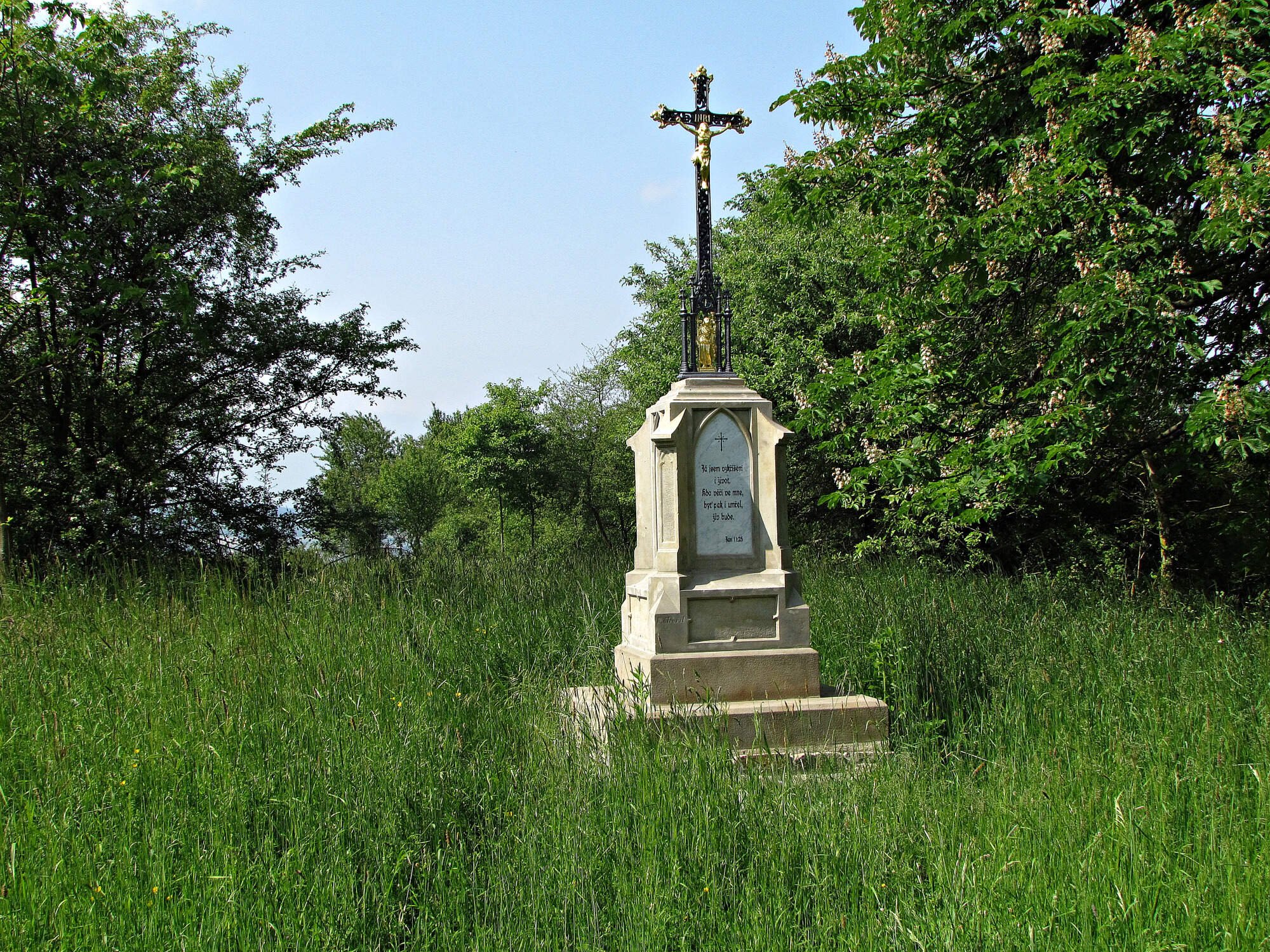Když jsem se od rozcestí na Černé hoře chtěl vydat dolů ke kapli sv.Rocha, zahlédl jsem na malebné louce, obklopené stromy, asi sto metrů napravo nějaký kříž. I šel jsem se k němu díky vrozené zvědavosti podívat a rozhodně těch „zbytečných“ kroků nelitoval. O žádnou unikátní sakrální památku sice nešlo, ale její umístění v prostoru bylo dokonalé a jistě i bohulibé.