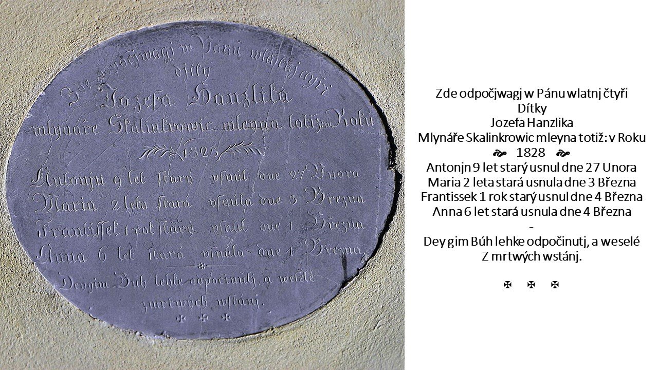 Na zdi kostela sv. Vavřince na hřbitově na Černovičkách je vedle dveří zazděna nenápadná kamenná deska. Připomíná rodinnou tragedii, která se odehrála r. 1828 v nedalekém Kalingrově mlýně. Během týdne zemřely čtyři malé děti. Příčina úmrtí se už neví.