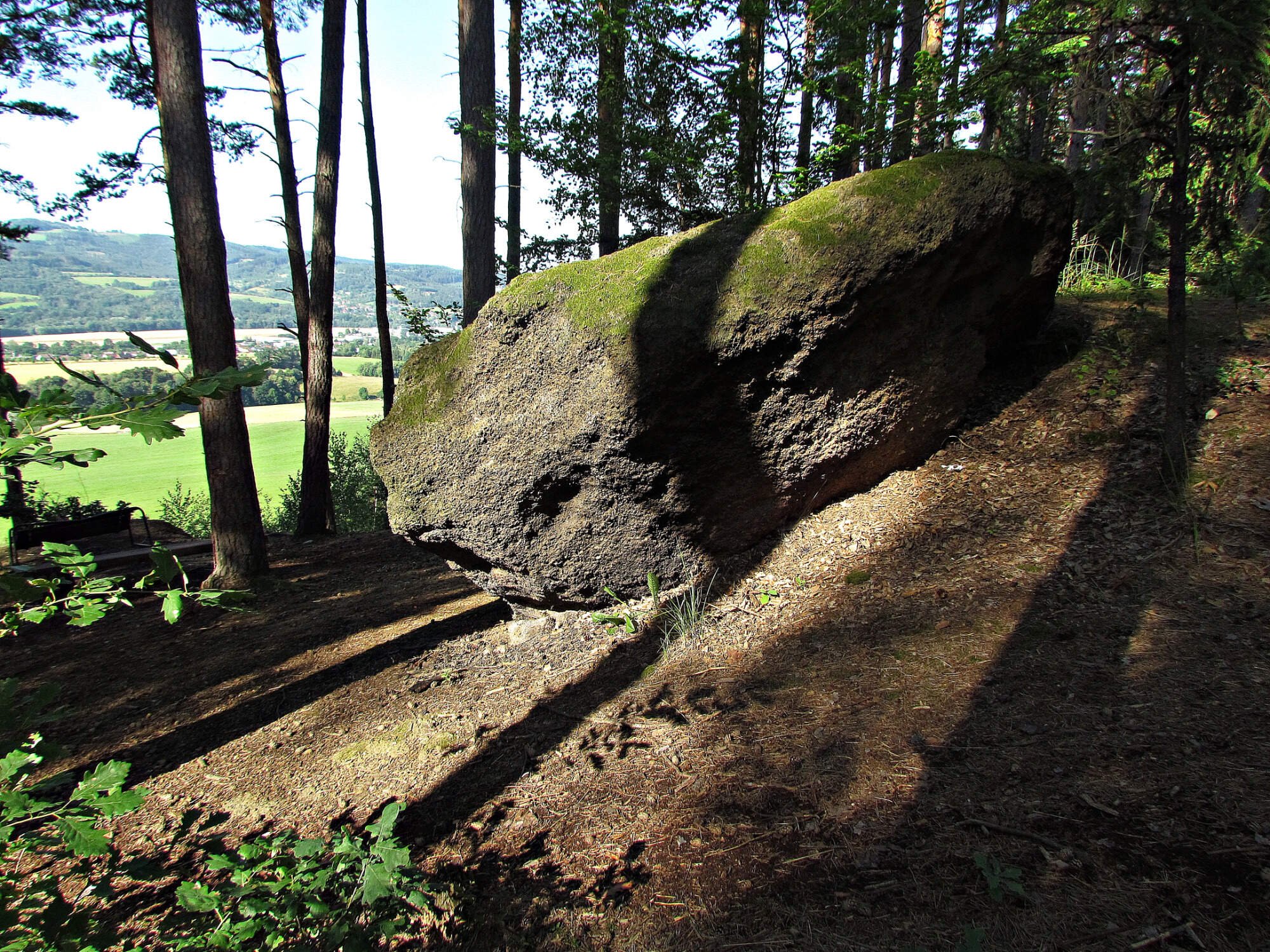 Od vyhlídky jsem se vrátil zpět na „hlavní“ a po několika stovkách metrů odbočil vlevo na lesní cestu procházející další vyvýšeninou. Tady už jsem narazil na vlastní Čertův kámen, který je sice – soudě podle ohnišť – oblíbenou destinací zašovské omladiny, ale běžný tůrista nad ním své velectěné chřípí spíše jen ohrne. Jedná se totiž o 5 m vysoký, dlouhý skalnatý hřbítek, kde zaujme jen její převislá severní stěna, pod níž prochází chodník.