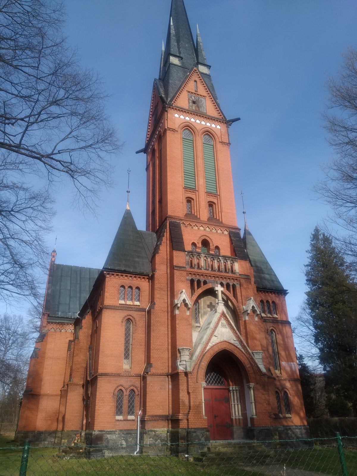 Památkově chráněný novogotický kostel, kterému se podle barvy cihel, ze kterých je postaven, říká červený.