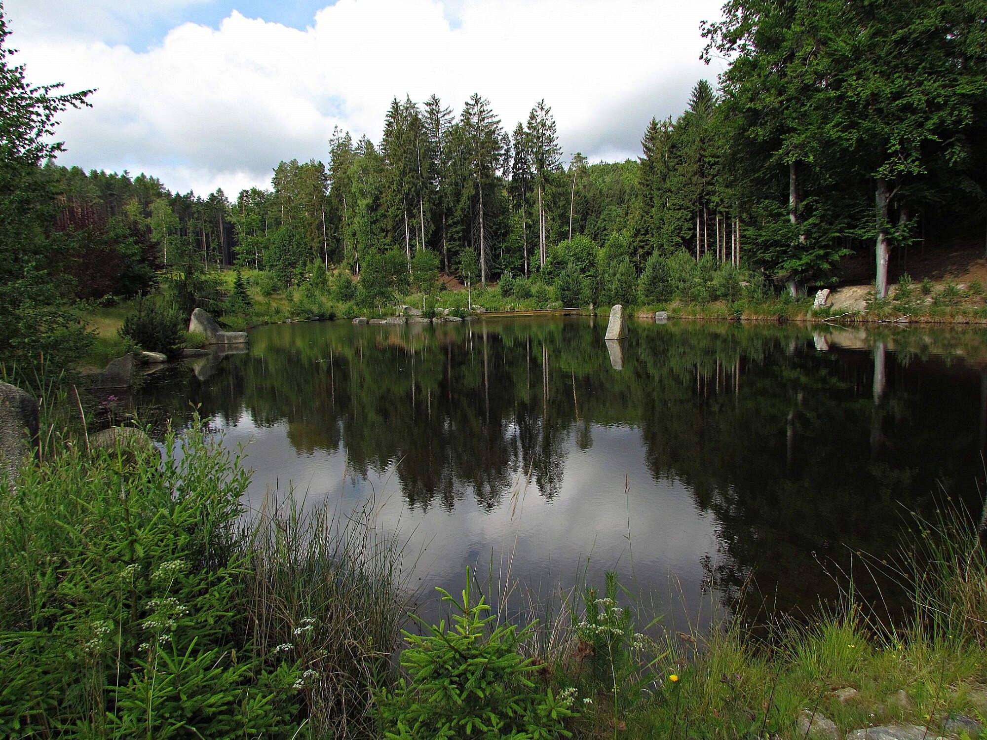 Od rozcestníku pod rozhlednou je to ke kaskádám po NS jen asi 300 m. Nejprve je nám dopřáno spatřit horní rybník, jehož vodní plocha dosahuje rozměrů 50 x 50 m a z jehož jižního konce vystupují nad vodní hladinu tři žulové balvany.