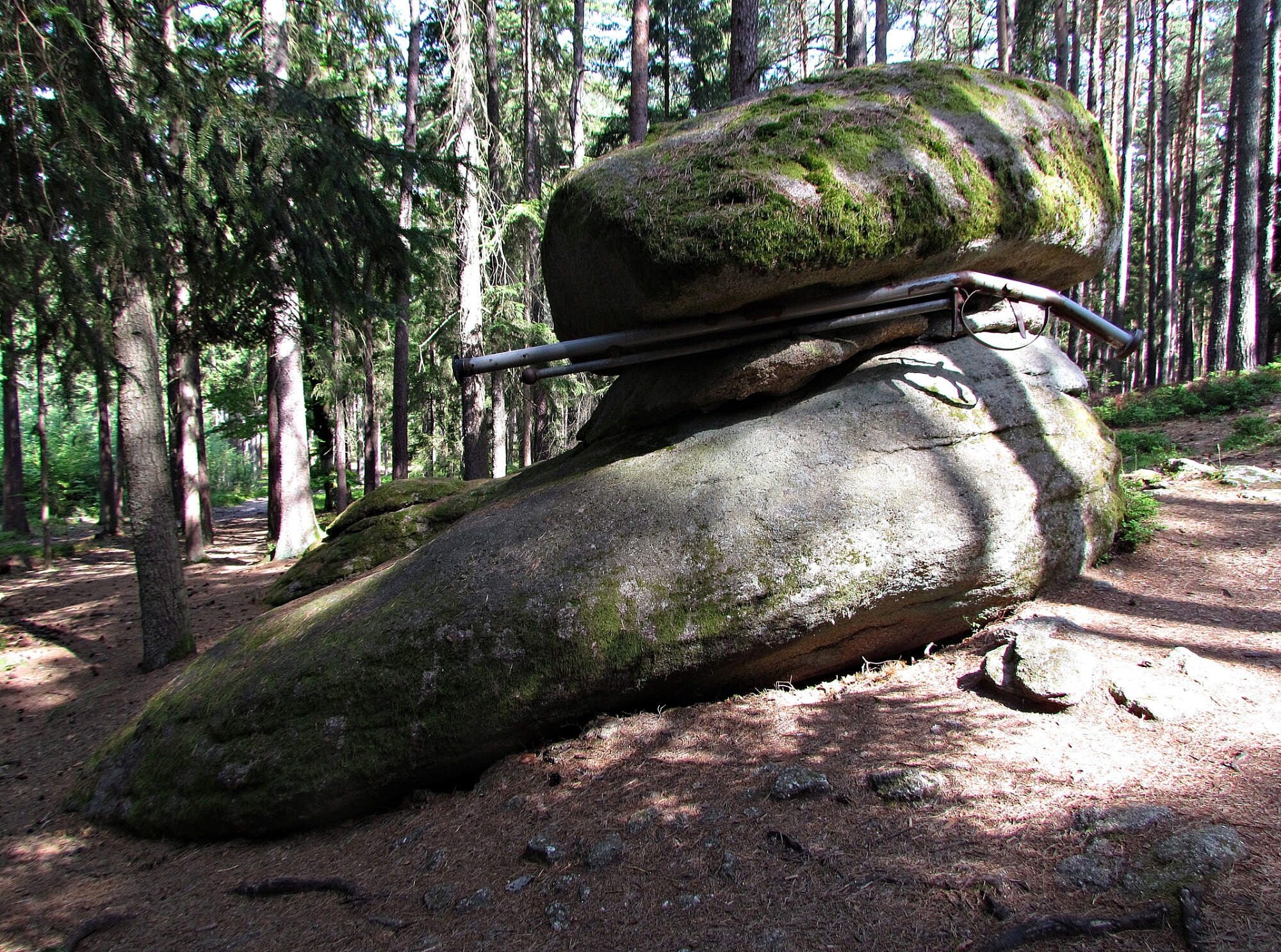 Po chvilce přijdeme k jednomu z nejznámějších místních skalních útvarů – nádhernému a fotogenickému hříbovitému žulovému toru, ozdobenému napodobeninou veliké historické flinty. Skalka se nazývá Graselova trojmužná předovka a pušku je možno si vyzkoušet.