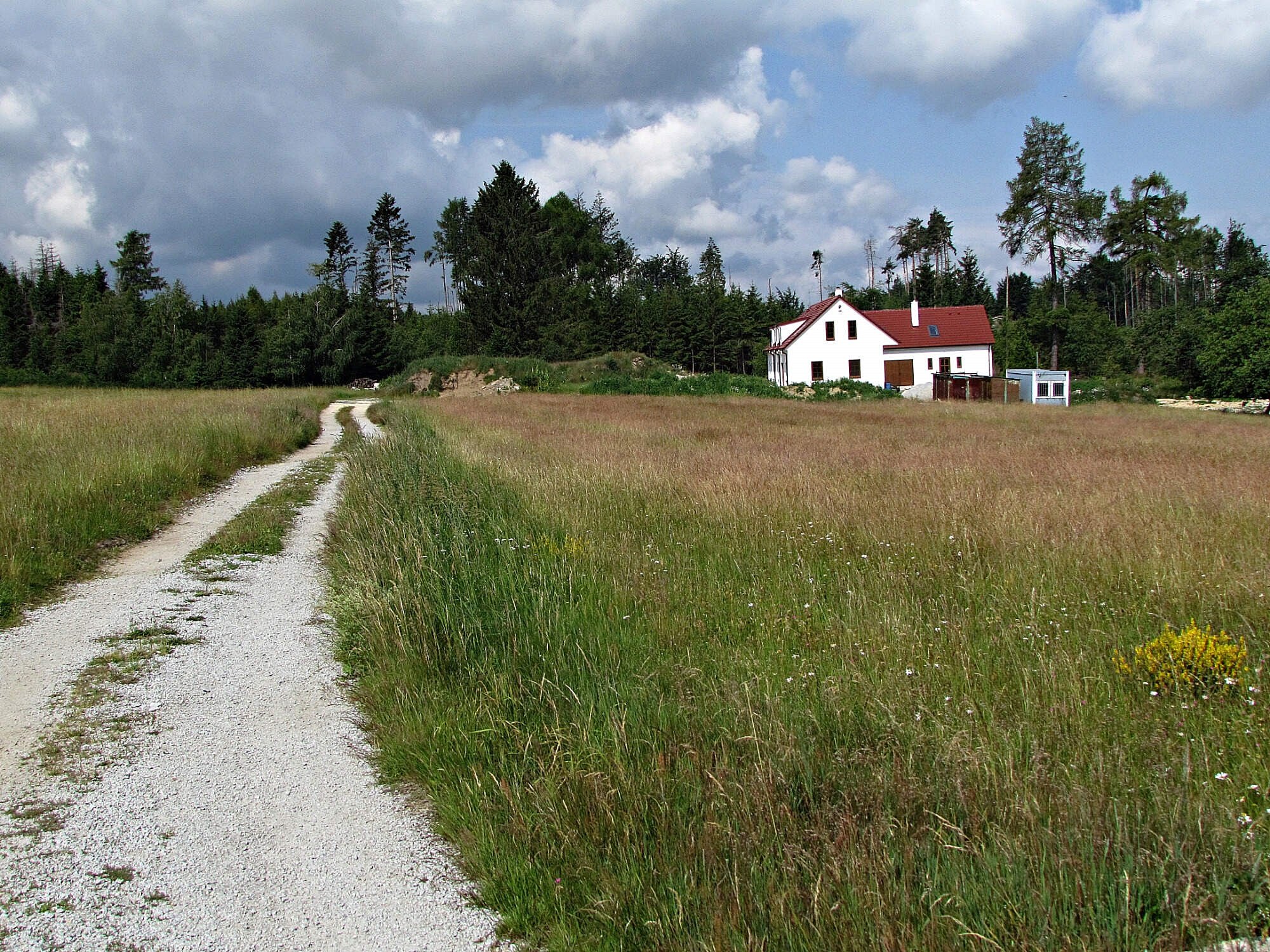 Od rozcestí zelená pokračuje severním směrem do blízkého Valtínova. Já zvolil neznačenou polní cestu vedoucí k západu okolo posledního, novotou zářícího stavení osady, a kousek za ním pokračoval po „lesní cestě“ ke kótě označené na mapách nadmořskou výškou 680 metrů.