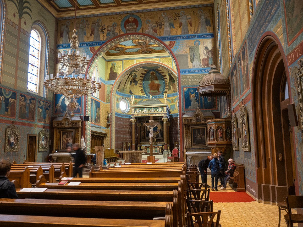 Nad vstupní částí je zpěvácká kruchta s varhanami. Samotná stavba byla realizována v l. 1899–1900. Prostor je upraven do podoby novorománského stylu, po bocích stavby jsou čtveřice vysokých obdélníkových oken s půlkruhovými vrcholy. Kostel je součástí kláštera Kongregace bratří Nejsvětější Svátosti, zkráceně Petrinuma. Bohatá výzdoba je dílem právě příslušníků tohoto řádu. Jejich individualita je tak utajená. Hlavní oltář je samozřejmě věnován oslavě Panny Marie Růžencové, cože je svátek připomínající vítězství křesťanského loďstva nad Turky u Lepanta (1572).