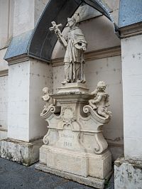 Patrně nejzajímavější částí díla je podstavec. Ten je pojat v třístupňovém členění. Spodní část je obdélníková s prolomenými rohy, střední část s prohlým středem a volutovými boky, vrchní stupeň je členěn do tří částí s bočními šikmými pilířky, které nesou postavy andílků. Na středním vyšší části je na poměrně masivní římse samotný svatý. Ten je zpodobněn víceméně v tradičním duch v kanovnickém rouchu. V levé ruce si přidržuje kněžskou štolu (taková široká stuha), v pravé ruce drží kříž. Pravá noha mírně předkročená, hlava je s biretem, nechybí kovová svatozář.